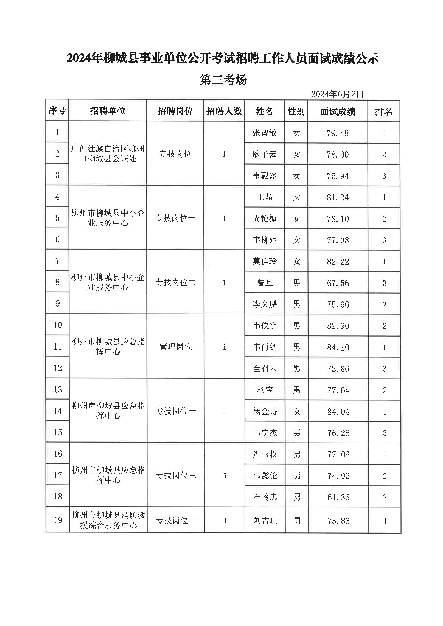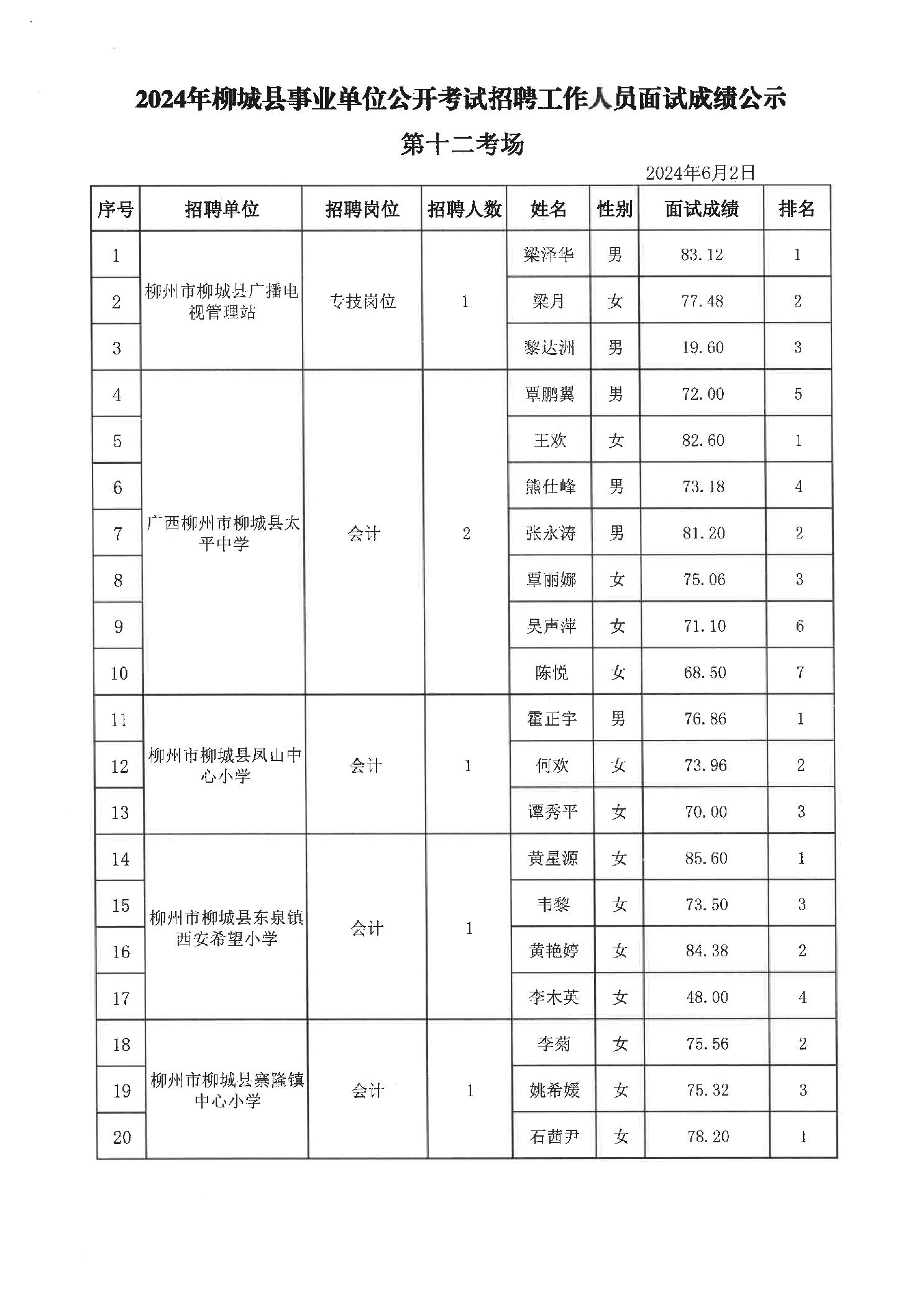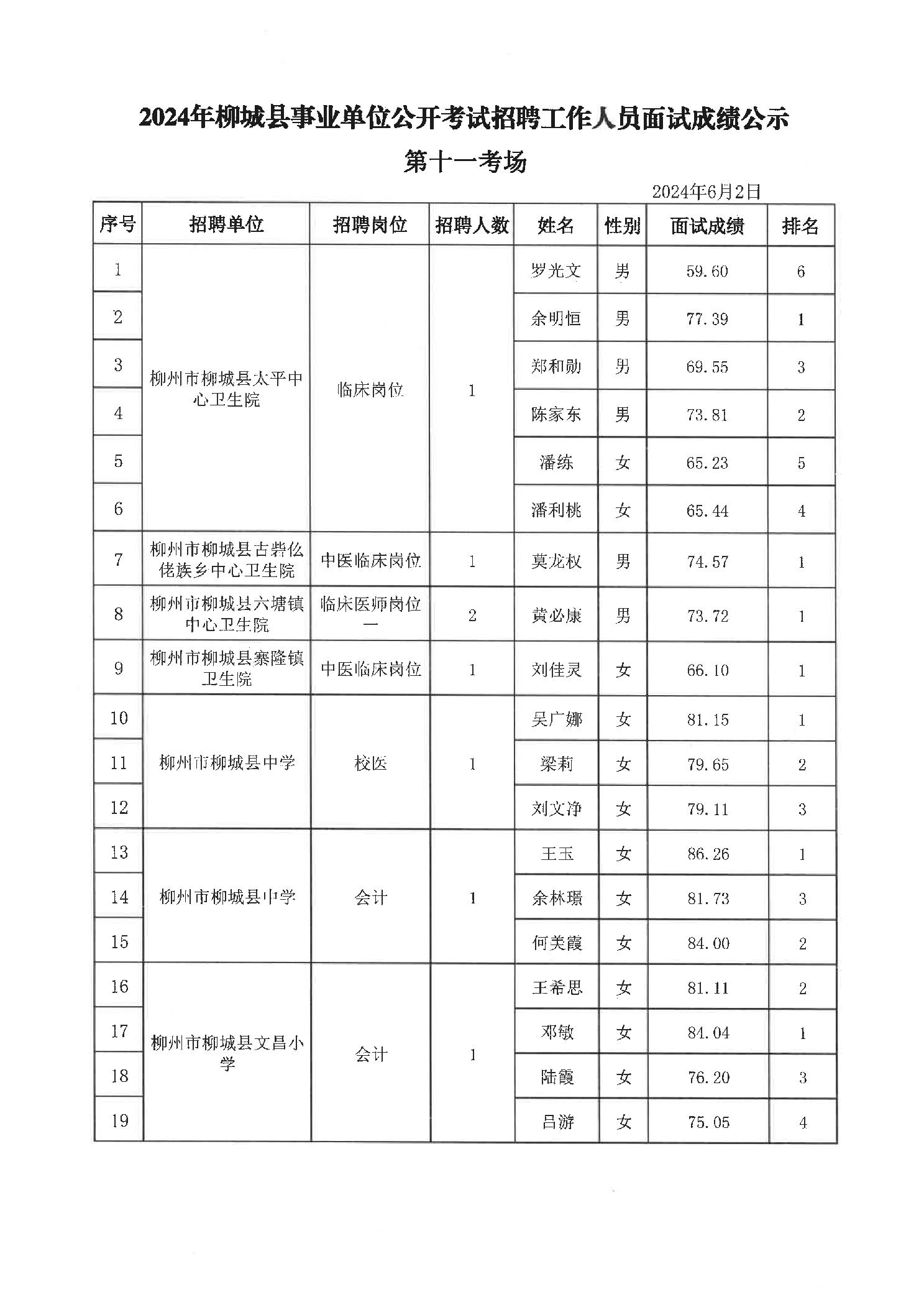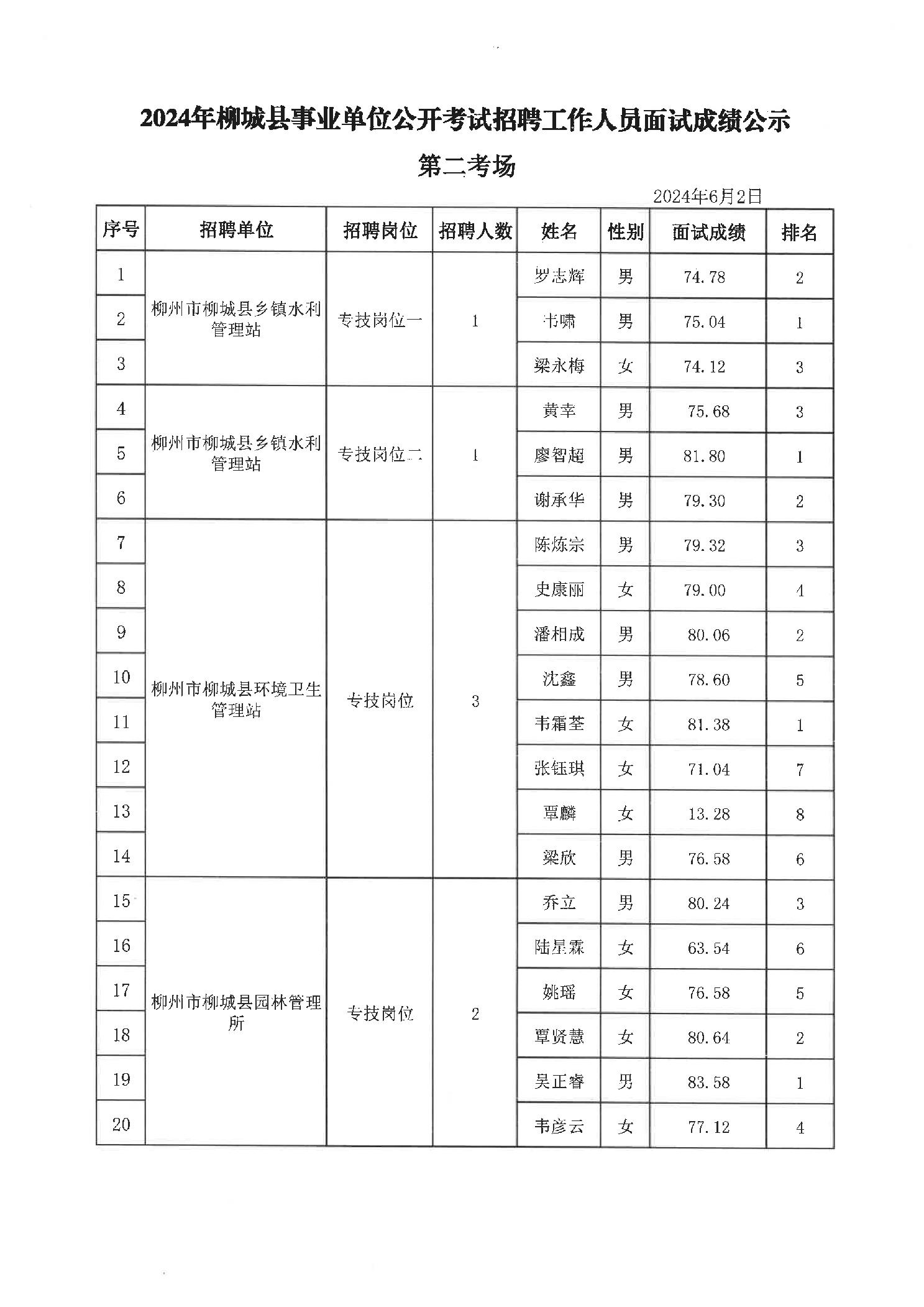 2024年柳城縣事業(yè)單位公開考試招聘工作人員面試成績公示