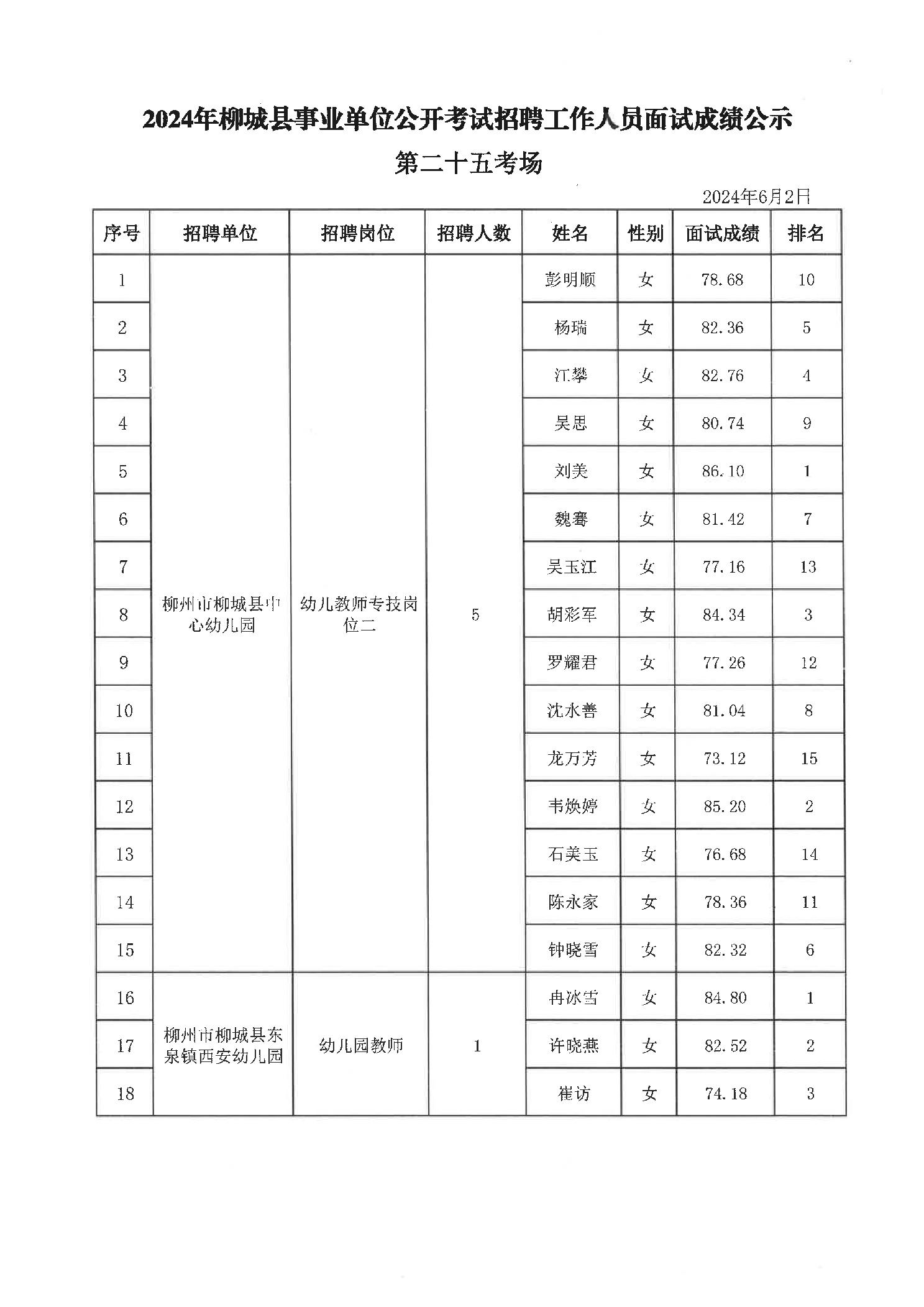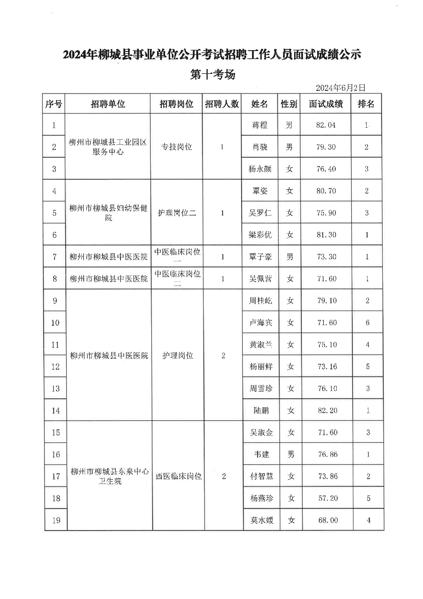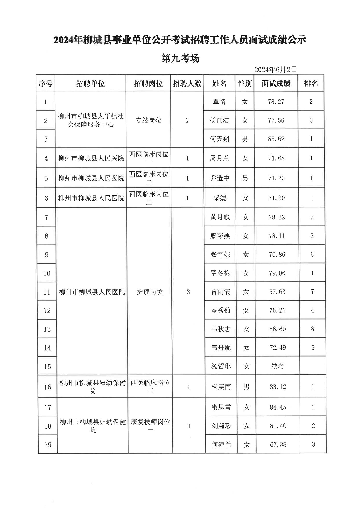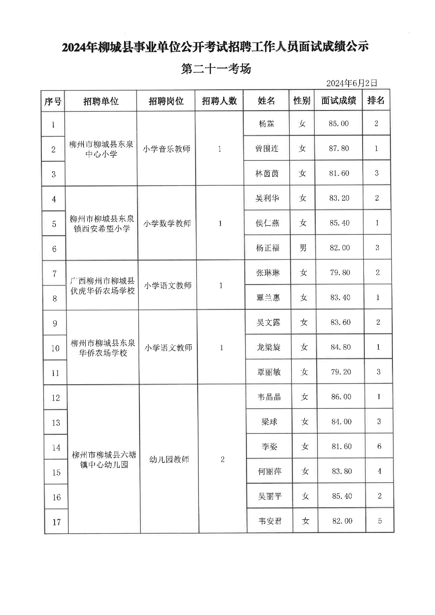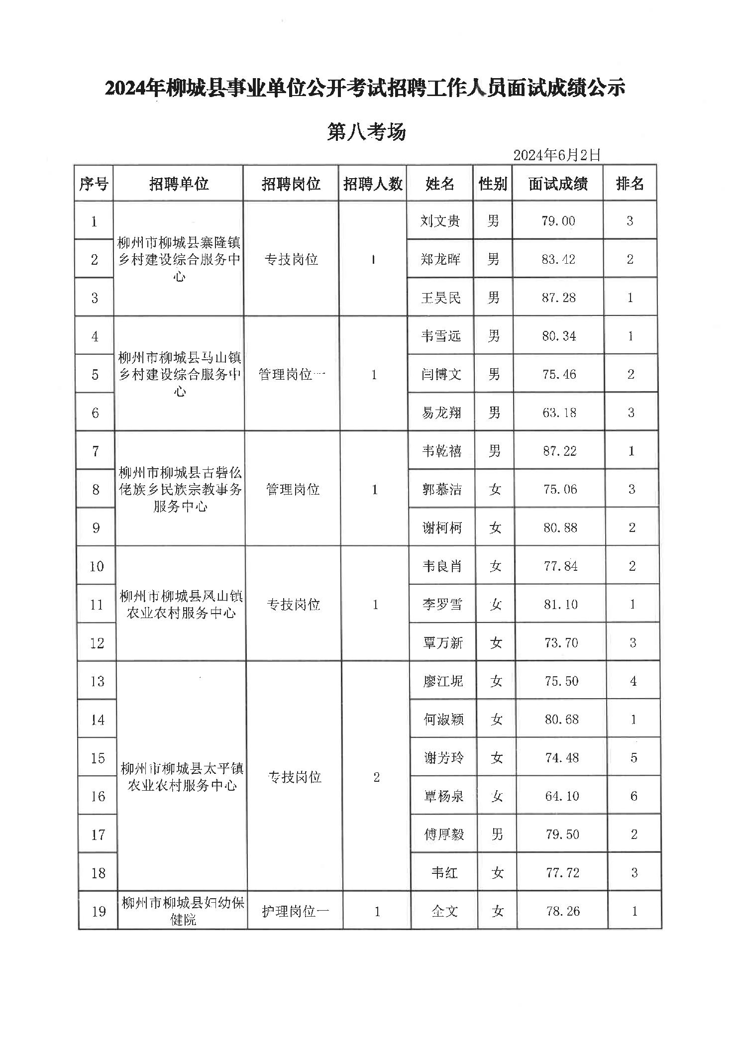 2024年柳城縣事業(yè)單位公開考試招聘工作人員面試成績公示