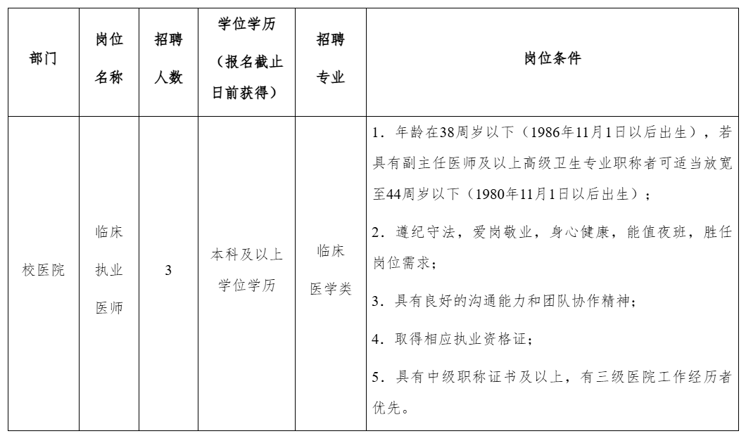 擬公開(kāi)招聘醫(yī)務(wù)工作人員3名,具體崗位及相關(guān)條件要求詳見(jiàn)下表: