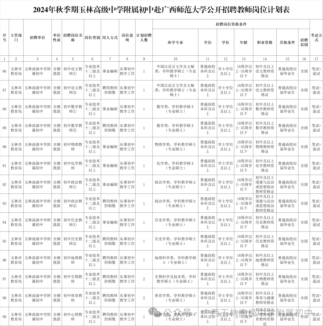 具體招聘信息請瀏覽玉林市人社局網站相關公告http://rsj.yulin.gov.cn/tszl/rsrc/sydwzk/t19343053.shtml,以《2024年秋季期玉林市教育局直屬學校赴廣西師范大學公開招聘教師公告》為準。