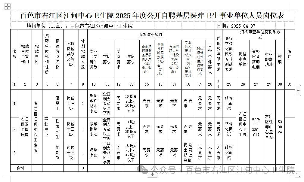 原文標(biāo)題:百色市右江區(qū)汪甸中心衛(wèi)生院2025年度公開(kāi)招聘基層醫(yī)療衛(wèi)生事業(yè)單位人員公告