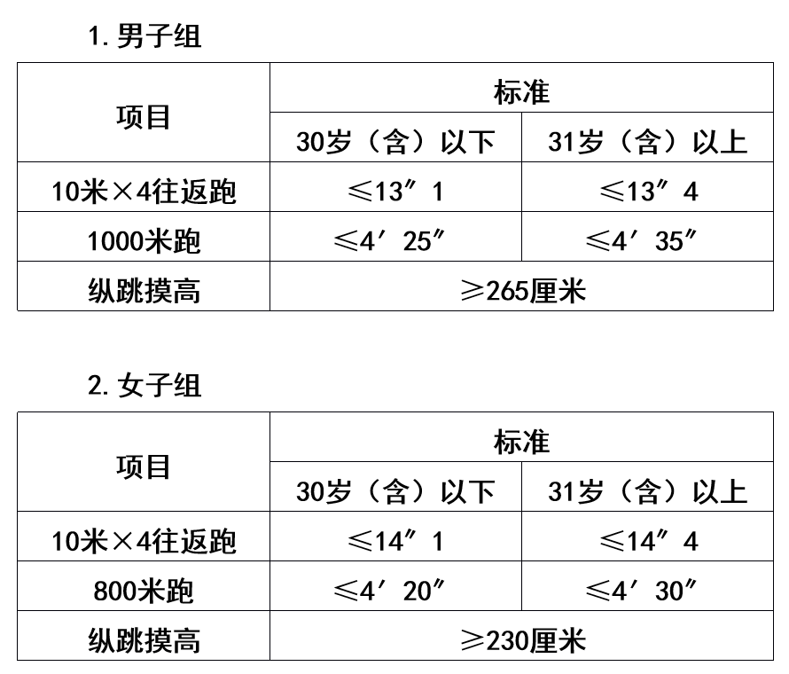 體能測評的項目和標準按照《關于印發(fā)〈公安機關錄用人民警察體能測評項目和標準〉的通知》(公政治〔2024〕60號)執(zhí)行,其中綜合管理類、執(zhí)法勤務類職位測查全部3個項目,警務技術類職位免予測查1000米(男)/800米(女)跑項目。對于專業(yè)人才緊缺難以形成競爭的特殊職位(緊缺職位),體能測評三項中有兩項達標的,視為合格。凡應測項目中任意一項不達標的,即為體能測評不合格。具體如下: