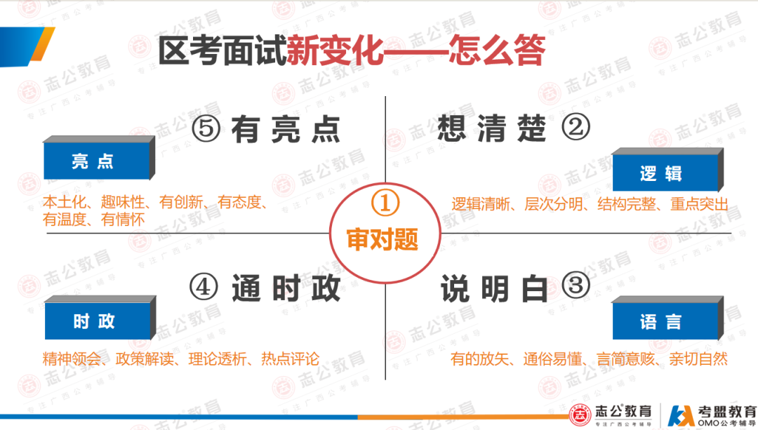 解決方法:一是進(jìn)行面試脫敏??梢远噙M(jìn)行考場(chǎng)還原和模擬,讓自己提早適應(yīng)面試緊張的氛圍和節(jié)奏。二是保持良好的答題狀態(tài)。考生在進(jìn)入考場(chǎng)前,可以拿以前的模擬題或者預(yù)測(cè)題,條件允許的話可以大聲讀出來,再不濟(jì)也要默讀題目,快速思考,做到胸有成竹。三是掌握答題邏輯。思考之后心中已經(jīng)有對(duì)策的時(shí)候,可以適當(dāng)預(yù)留幾秒鐘思考如何說得清楚、讓人聽得明白。四是概括題目破題切入。這是最簡(jiǎn)單有效的方法,不需要假大空,也不需要深度思考,以題目為抓手,但注意不要直接念題干。這種答題方式,可以給考官扣題作答的感受。