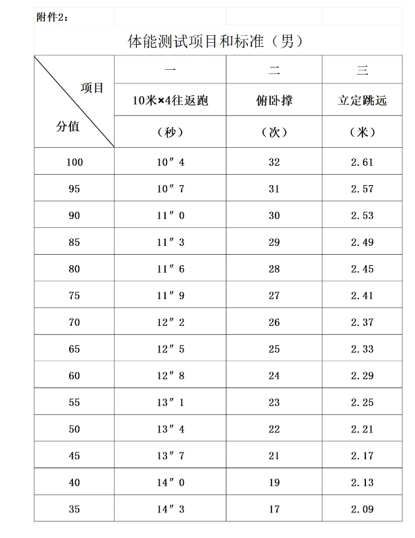 3.體能測試。參照人民警察招錄標準執(zhí)行(具體項目和標準詳見附件2)。測試項目:10米×4往返跑、立定跳遠、俯臥撐,體能測試三項全部達標的,方為合格。