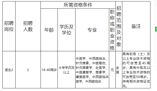 根據(jù)工作需要,決定面向社會公開招聘醫(yī)生(中醫(yī)類)2人,現(xiàn)將有關(guān)事項(xiàng)公告如下:
