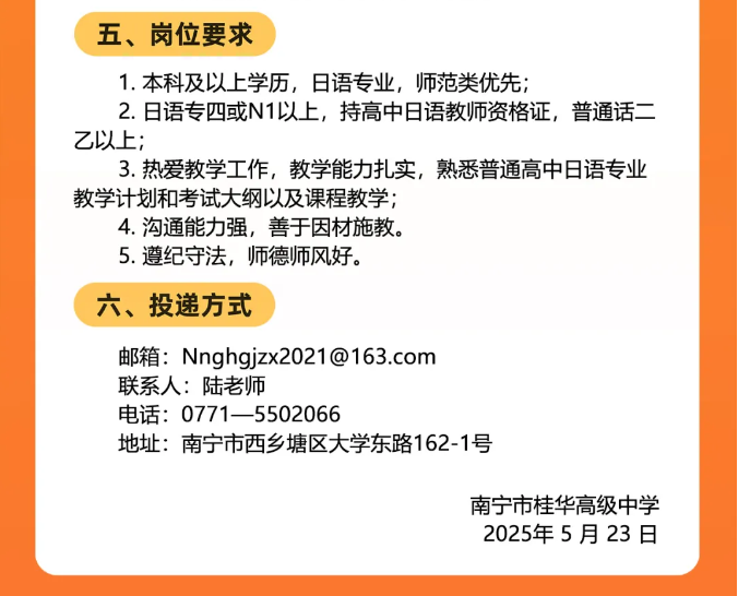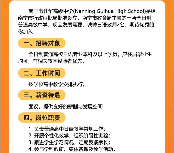 2025年廣西南寧市桂華高級(jí)中學(xué)面向社會(huì)公開招聘日語老師2人