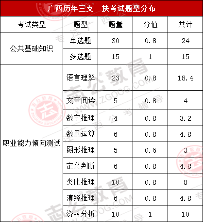 上篇我們寫到,三支一扶的待遇,在廣西這個待遇還算不錯,政策上的支持也非常好,那么預計這個月月底出公告的三支一扶,啥時候筆試呢?2024年廣西三支一扶筆試時間是7月13日,其筆試科目為《綜合知識》一科,滿分100分?;谕昕忌幕貞洠C合知識內(nèi)容主要包括公共基礎知識和行測職業(yè)能力測試兩個科目,而各題型的題量及分值如下圖所示: