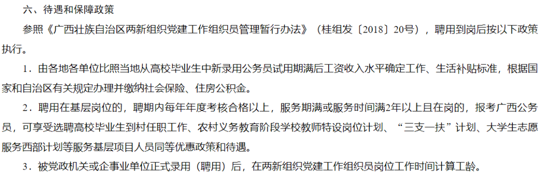 如果是符合條件的黨員朋友可要抓住這次機(jī)會(huì)了??,不僅“由各地各單位比照當(dāng)?shù)貜母咝.厴I(yè)生中新錄用公務(wù)員試用期滿(mǎn)后工資收入水平確定工作、生活補(bǔ)貼標(biāo)準(zhǔn),根據(jù)國(guó)家和自治區(qū)有關(guān)規(guī)定辦理并繳納社會(huì)保險(xiǎn)、住房公積金。”服務(wù)期滿(mǎn)還參照三支一扶等服務(wù)基層項(xiàng)目人員同等優(yōu)惠政策和待遇,而且!這個(gè)考試只用筆試,不用面試,香,實(shí)在是太香了!