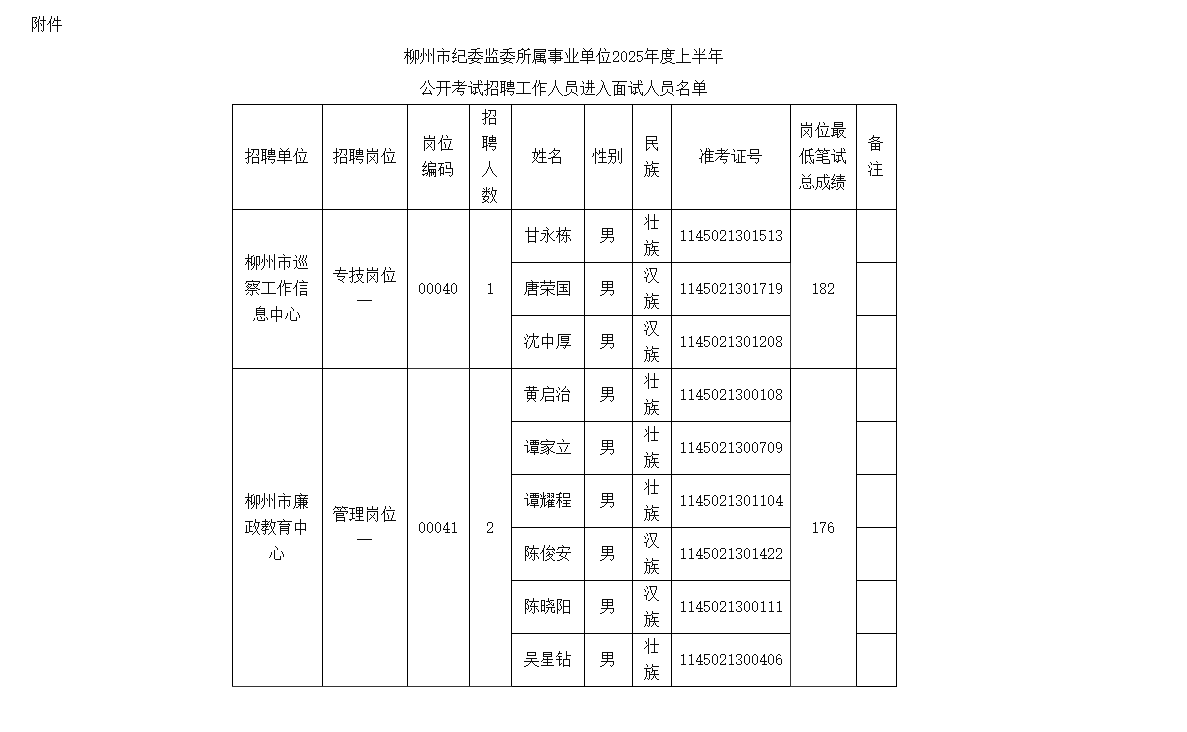 附件:《柳州市紀(jì)委監(jiān)委下屬事業(yè)單位2025年度上半年公開考試招聘工作人員進入面試人員名單》