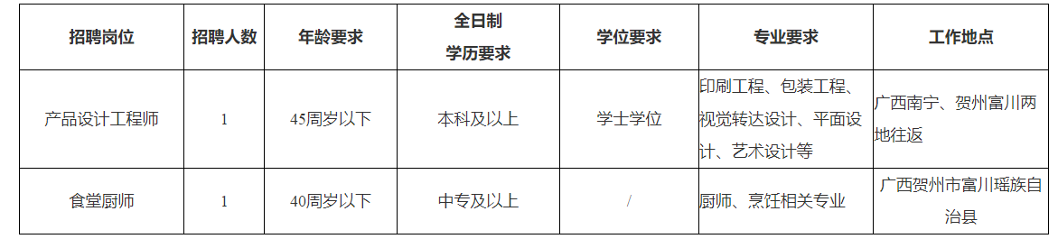 本次公開招聘2人,需求崗位、人數(shù)、學歷專業(yè)要求等資格條件,工作內(nèi)容、職位要求詳見附件《廣西真龍彩印包裝有限公司2025年第一批次人才招聘需求表》