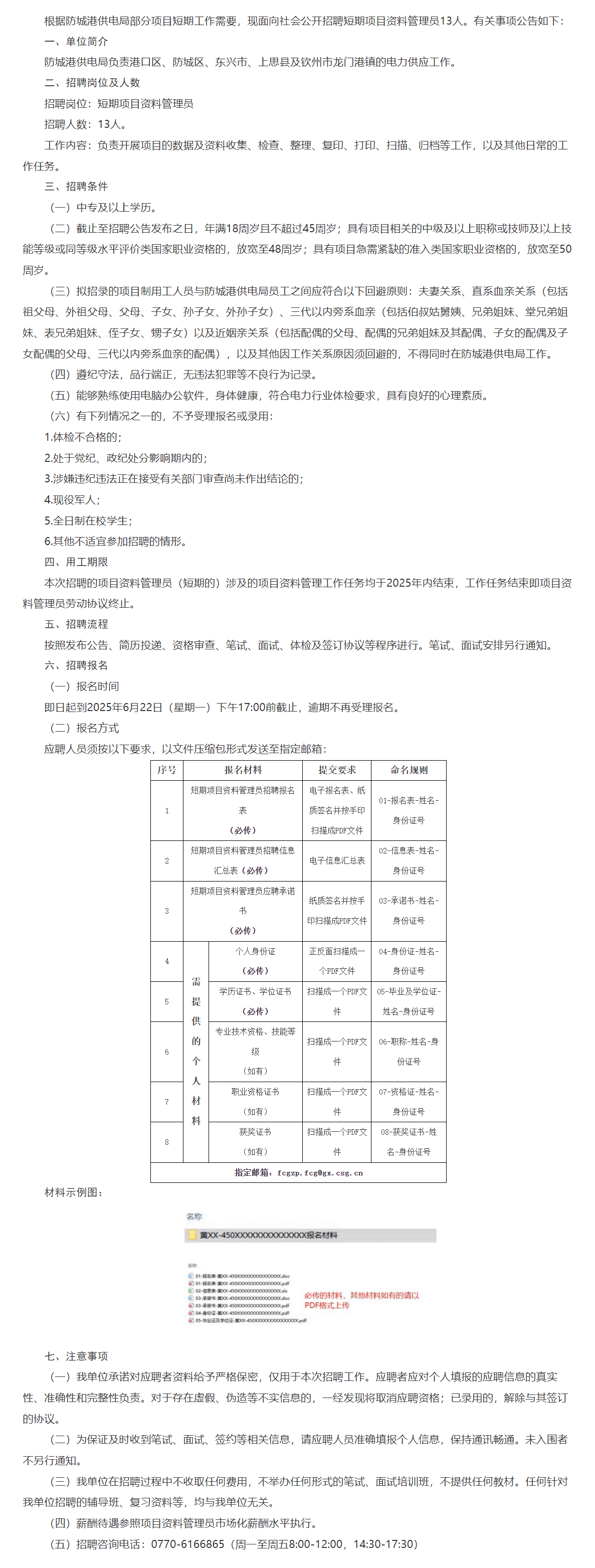原文標題:防城港供電局2025年短期項目資料管理員招聘公告