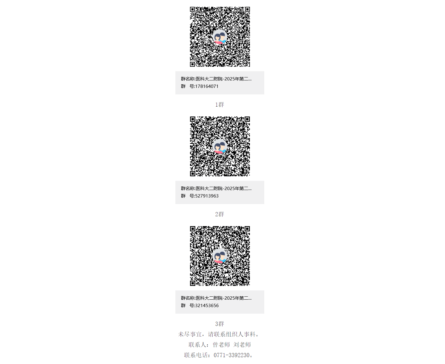 考核與面試的時間、地點另行通知,擇優(yōu)聘用。通過資格審核的考生名單及相關(guān)考試事宜將在“醫(yī)科大二附院-2025年第二批醫(yī)技藥行政招聘群”發(fā)布,請應(yīng)聘者務(wù)必進群并關(guān)注群消息,不再另行通知。請通過搜索群號碼(1群:178164071、2群:527913963、3群:321453656)或掃碼加群(1群滿后請加2群、3群):