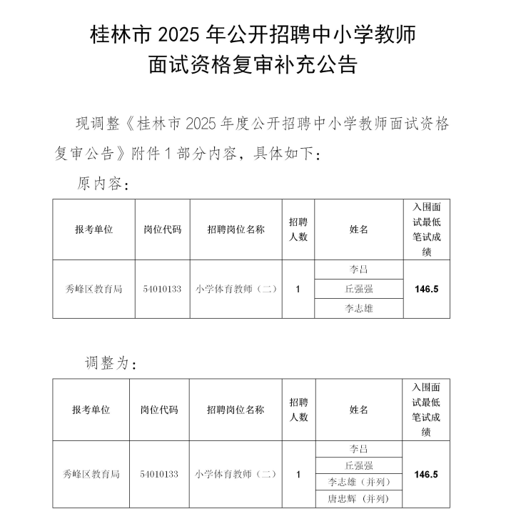 桂林市2025年公開招聘中小學(xué)教師面試資格復(fù)審補充公告