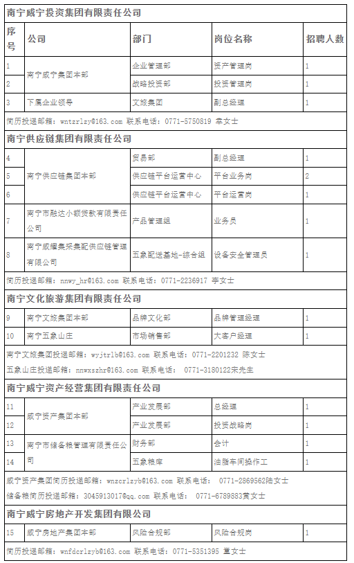 南寧威寧投資集團有限責任公司現(xiàn)因集團業(yè)務(wù)高速發(fā)展需要,集團本部及各下屬企業(yè)誠邀各類優(yōu)秀人才加盟,公司將提供完善的激勵晉升機制及廣闊的發(fā)展空間。熱忱歡迎有志之士加盟,公司將為您提供完善的激勵晉升機制及廣闊的發(fā)展平臺,招聘崗位、人數(shù)及崗位要求詳見附件。