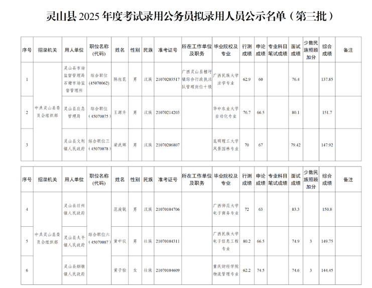附件:靈山縣2025年度考試錄用公務(wù)員擬錄用人員公示名單(第三批)