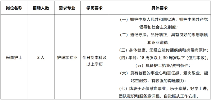 報名所需材料:《河池市中心血站公開招聘報名表》(附件)、個人簡歷、畢業(yè)證書、學位證書、護士執(zhí)業(yè)證/資格證、身份證等,若個人具備特長,需一并附上相關佐證材料。請攜帶以上材料原件及復印件至指定報名地點。應聘人員應對報名材料的真實性負責,凡弄虛作假的,一經(jīng)查實,即取消報名和聘用資格。