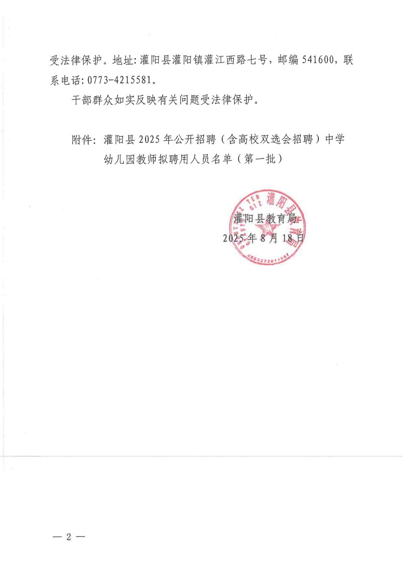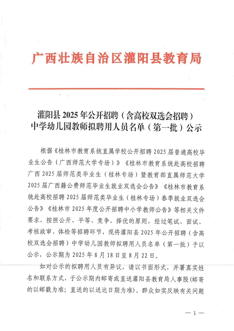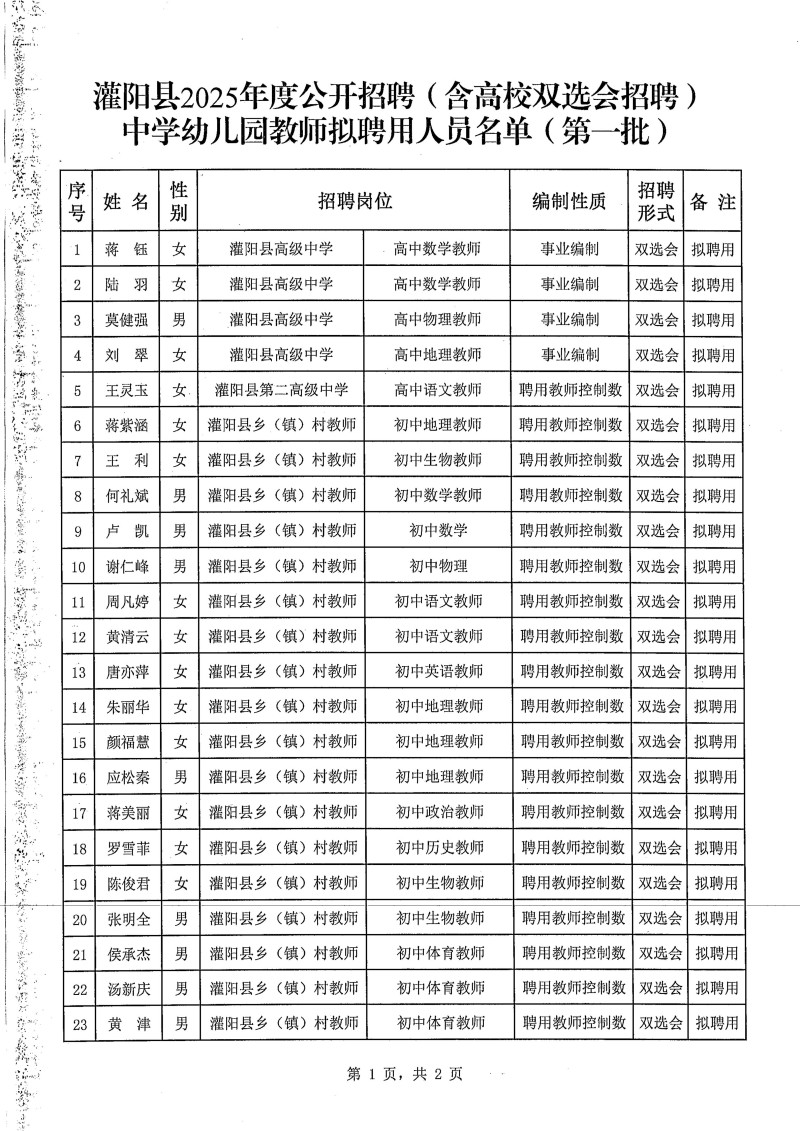 灌陽(yáng)縣2025年公開招聘(含高校雙選會(huì)招聘)中學(xué)幼兒園教師擬聘用人員名單(第一批)公示