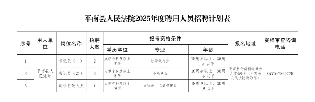 本次招聘崗位為書記員4名,司法行政人員1名。詳見附件1《平南縣人民法院2025年度聘用人員招聘計(jì)劃表》(以下簡(jiǎn)稱《招聘計(jì)劃表》)。