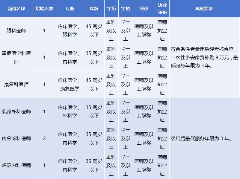 ■ 眼科、康復醫(yī)學科、重癥醫(yī)學科醫(yī)師為我院緊缺崗位人才,符合條件錄用者,經(jīng)試用考核合格后可享受安家費補貼。