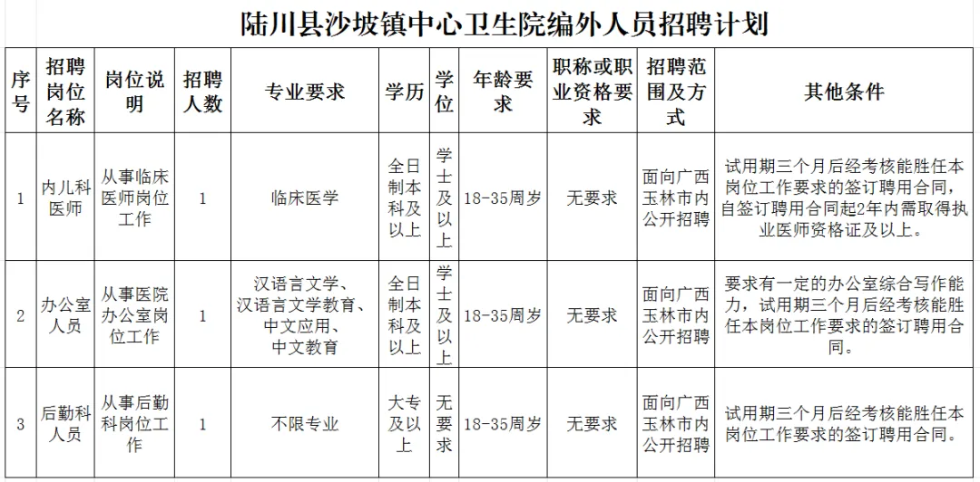 2025年陸川縣沙坡鎮(zhèn)中心衛(wèi)生院公開招聘編外人員公告