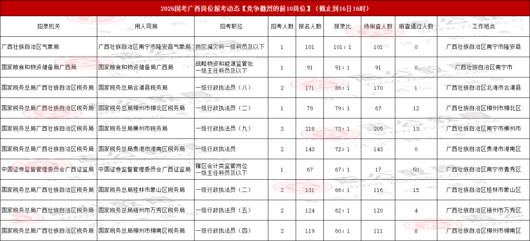 廣西區(qū)報名競爭最激烈前十職位情況匯總