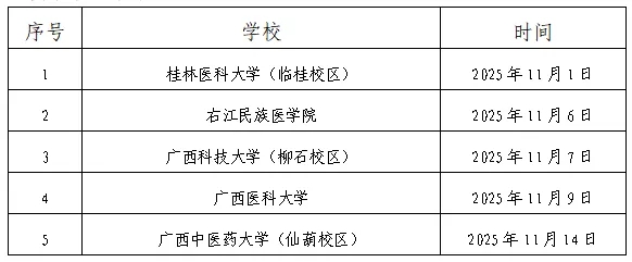 采取現(xiàn)場報(bào)名方式的人員請前往桂林醫(yī)科大學(xué)、右江民族醫(yī)學(xué)院、廣西科技大學(xué)、廣西醫(yī)科大學(xué)、廣西中醫(yī)藥大學(xué)等區(qū)內(nèi)各院校雙選會現(xiàn)場進(jìn)行應(yīng)聘。廣西區(qū)內(nèi)各院校雙選會舉辦時(shí)間詳見下表。