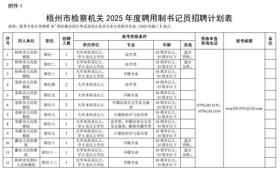 詳見(jiàn)《梧州市檢察機(jī)關(guān)2025年度聘用制書(shū)記員招聘計(jì)劃表》(附件1)。