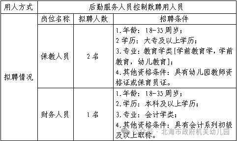 為滿足幼兒園后勤服務用人的需要,擬向社會公開招聘后勤服務人員控制數工作人員3名。