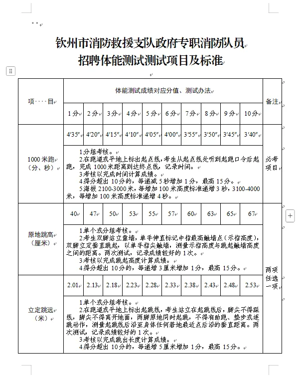 2.體能測試:(1)必考項目:1000米跑;(2)選考項目:①立定跳遠、原地跳高二選一;②單杠引體向上、俯臥撐二選一;③10米×4往返跑、100米跑二選一;(3)注意事項:應(yīng)聘人員須參加體能測試,并當場簽訂《體能測試健康安全風險承諾書》,體能測試有兩項及兩項以上不得分的視為不合格(標準參照附件)。未按時參加或因身體原因無法測試者,視為自動放棄。(體能測試測試項目及標準附后)