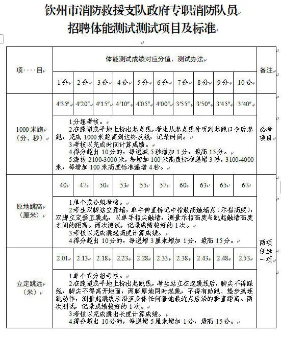 2.體能測試:(1)必考項目:1000米跑;(2)選考項目:①立定跳遠、原地跳高二選一;②單杠引體向上、俯臥撐二選一;③10米×4往返跑、100米跑二選一;(3)注意事項:體能測試有兩項及兩項以上不得分的視為不合格(標準參照附件)。未按時參加或因身體原因無法測試者,視為自動放棄。