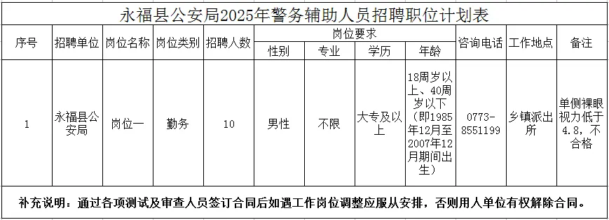 計(jì)劃招聘警務(wù)輔助人員10名。具體崗位、招聘人數(shù)、資格條件詳見《永??h公安局輔警招聘計(jì)劃表》。