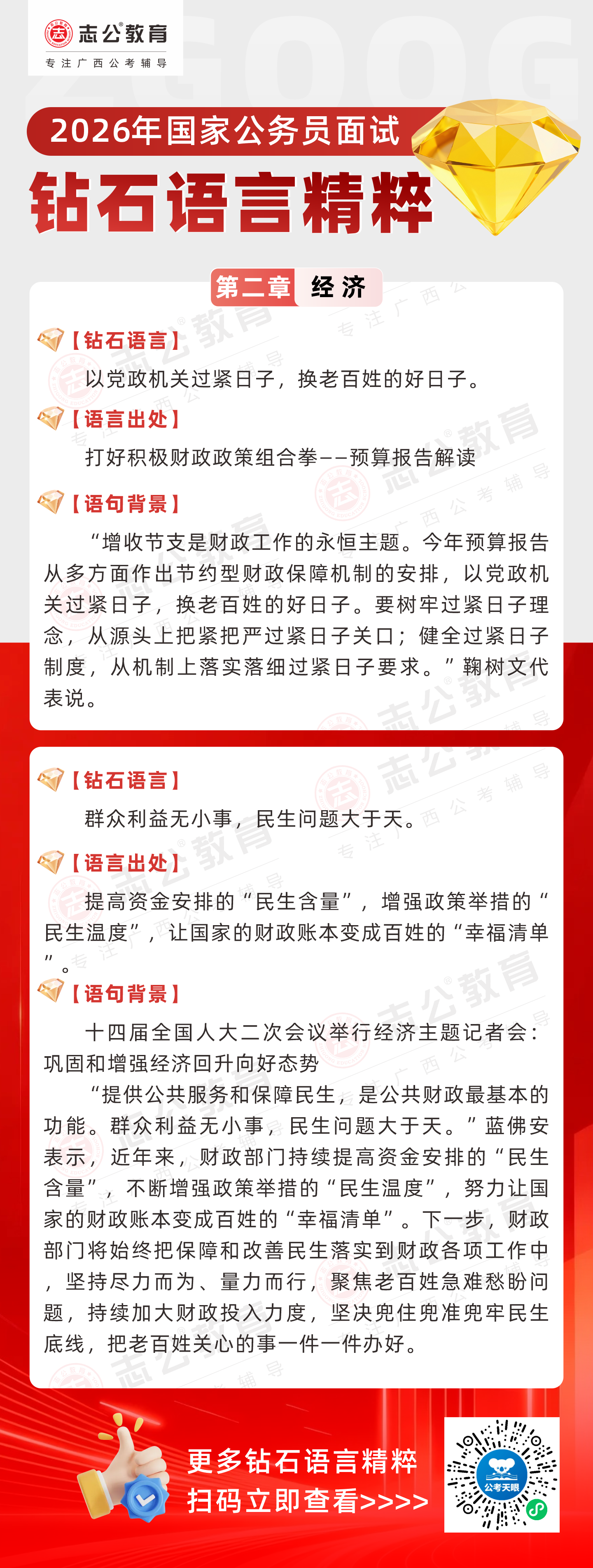 志公教育推出《2026國(guó)家公務(wù)員面試·鉆石語言精粹》經(jīng)濟(jì)篇!幫助考生把握經(jīng)濟(jì)類題目應(yīng)答邏輯,提升語言表達(dá)層次,助你在面試中脫穎而出。備考2026國(guó)考面試,從掌握“鉆石語言”開始!