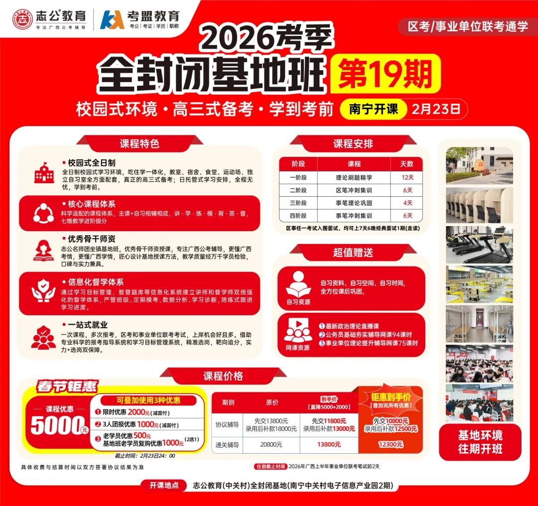 ?校園式環(huán)境,隔絕外界干擾:志公教育(中關(guān)村)2026考季全封閉基地班19期打造全日制校園式學習環(huán)境,高三嚴管式備考,一直可以學到考前。如果你自律性較差,需要一個好的學習氛圍和環(huán)境;如果你想要更快速上/岸,那你需要一個科學的學習體系,如果你想要考更好的職位,那你需要個性化和有效的提分方案,那么恭喜你,已經(jīng)找到了解決方法,請來志公教育全封閉基地班!