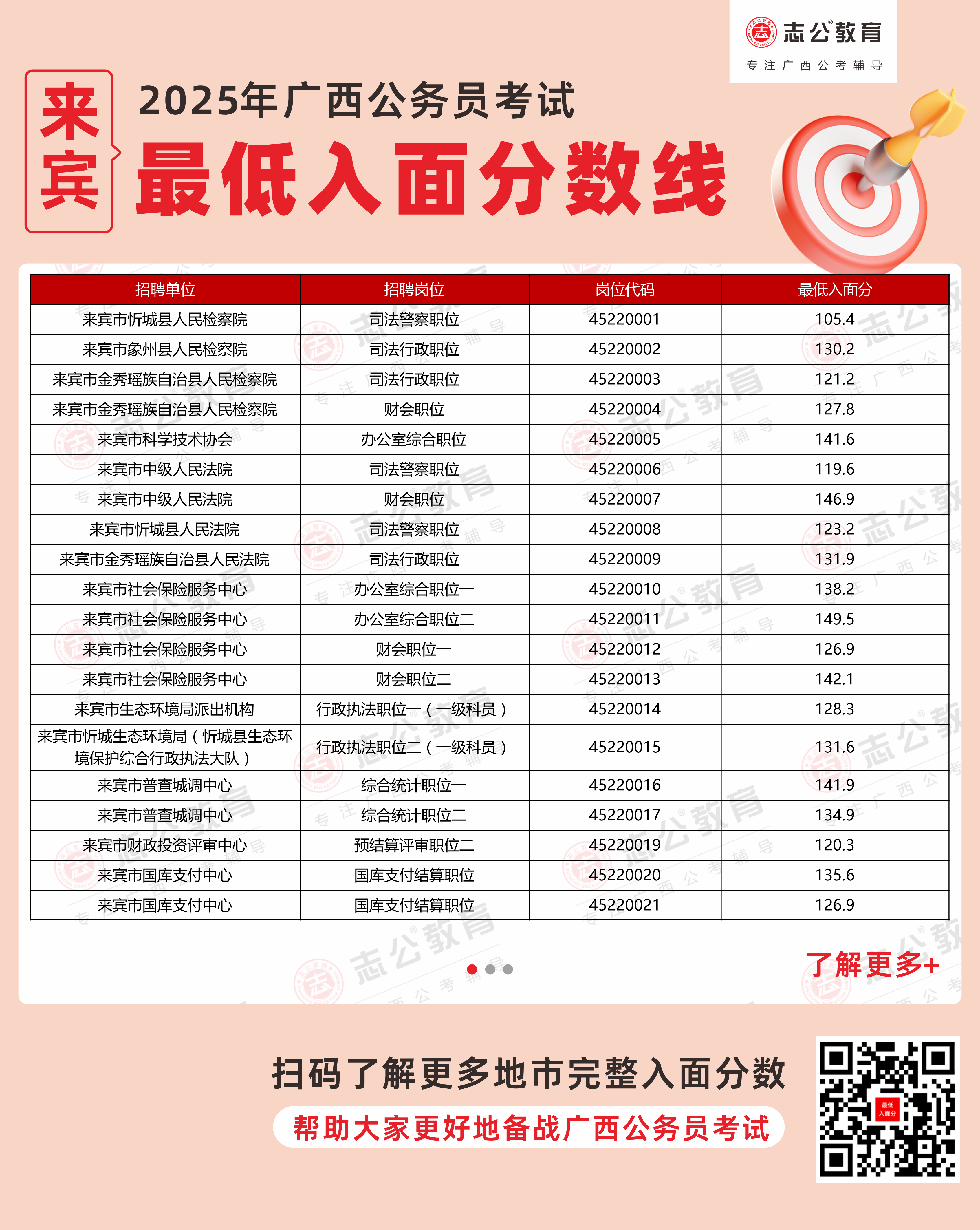 2025年廣西公務(wù)員考試筆試成績(jī)及面試入圍名單已公布。作為桂中地區(qū)重要城市和新興工業(yè)城市,來(lái)賓市的招錄職位一直備受考生關(guān)注。為幫助考生了解各單位招錄情況,本文根據(jù)官方發(fā)布的面試資格審查公告,整理了部分來(lái)賓市直及縣區(qū)單位的進(jìn)面分?jǐn)?shù)數(shù)據(jù),供廣大考生在備考過(guò)程中進(jìn)行參考。