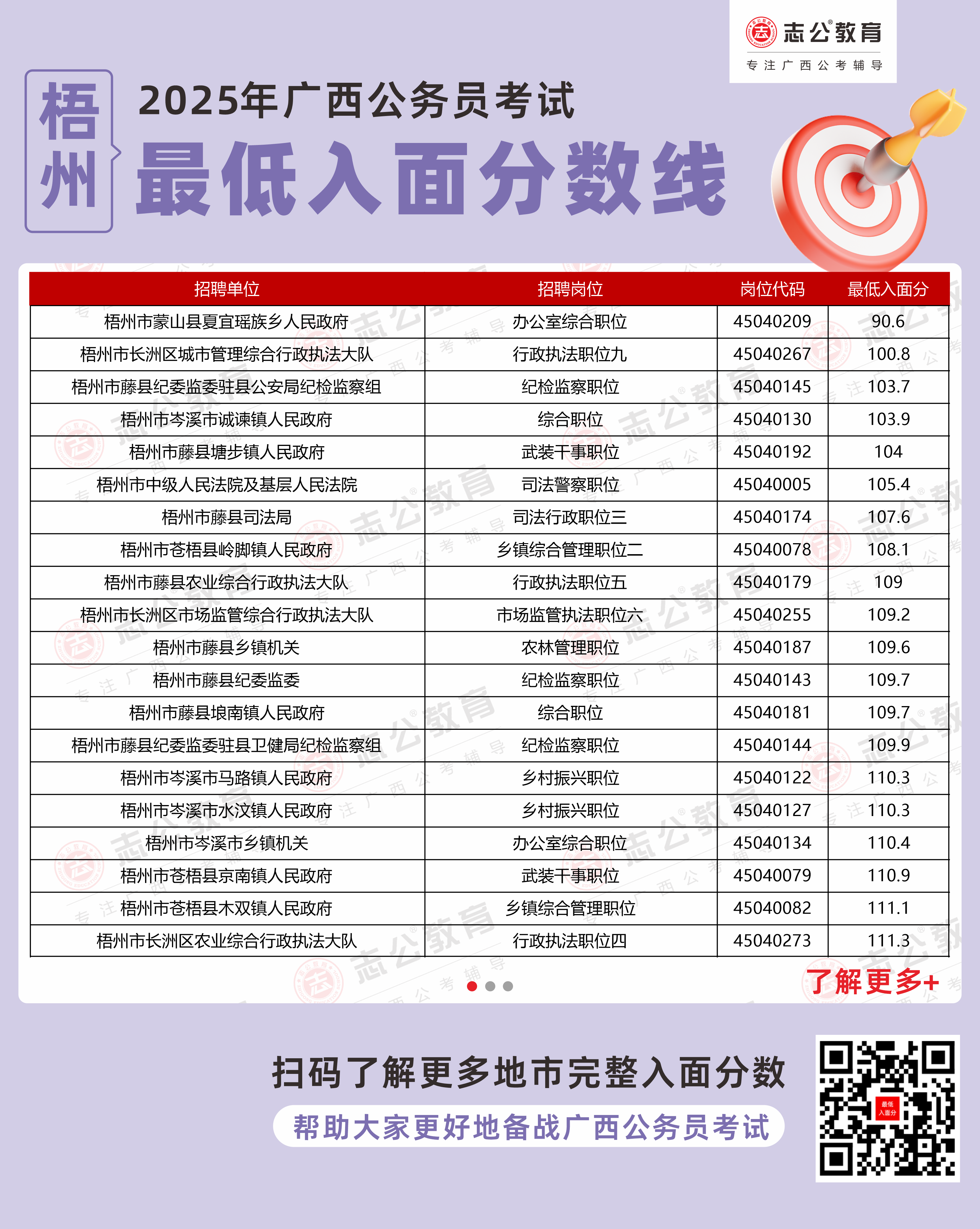 以下為志公教育根據(jù)官方發(fā)布的面試資格審查公告及公開數(shù)據(jù)整理的梧州市部分單位的進(jìn)面最低筆試分?jǐn)?shù)(含照顧加分),數(shù)據(jù)僅供參考,具體以官方實際公布為準(zhǔn)。