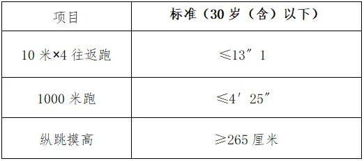 體能測評(píng)項(xiàng)目中,縱跳摸高的測試次數(shù)不超過3次,10米×4往返跑測評(píng)次數(shù)為2次,1000米跑的測評(píng)次數(shù)為1次。應(yīng)聘人員體能測評(píng)三項(xiàng)全部達(dá)標(biāo)的方為合格。