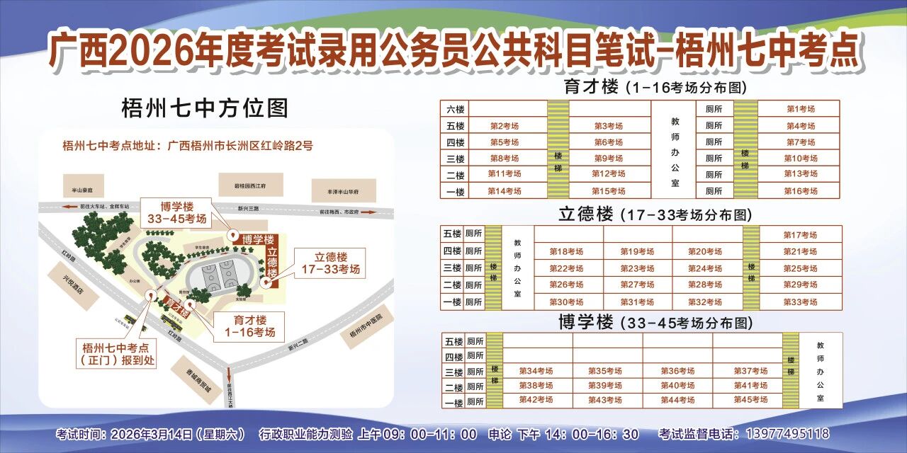 一、廣西2026年度考試錄用公務(wù)員(選調(diào)生)公共科目筆試將于3月14日舉行,梧州考區(qū)共設(shè)置10個(gè)考點(diǎn),請(qǐng)考生提前熟悉各自考點(diǎn)位置、周邊環(huán)境及交通情況,考試當(dāng)天提前出門做好準(zhǔn)備,準(zhǔn)時(shí)參加考試。