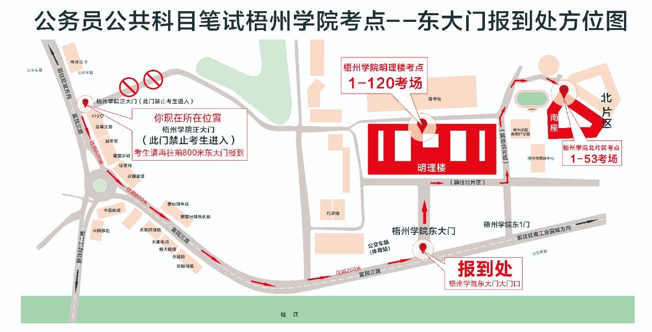 (九)梧州學(xué)院明理教學(xué)樓、梧州學(xué)院北片區(qū)(萬秀區(qū)富民三路82號(hào))特別提醒:明理教學(xué)樓和北片區(qū)屬不同考點(diǎn),請(qǐng)考生看清楚準(zhǔn)考證,切勿走錯(cuò)考場(chǎng)。