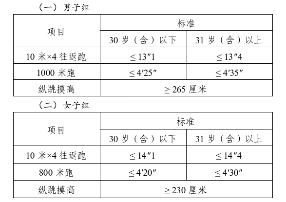 體能測評三項全部達(dá)標(biāo)方為合格。其中:縱跳摸高的測試次數(shù)不超過3次,10米×4往返跑的測試次數(shù)不超過2次,1000米跑/800米跑的測評次數(shù)為1次。